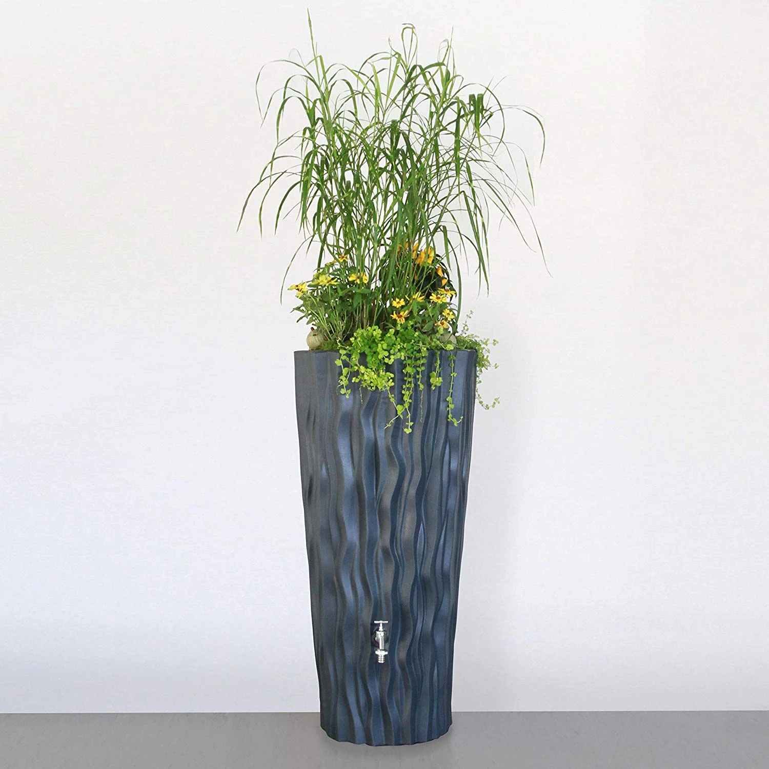 Deze stijlvolle grijze kleurige regentonnen met geintregeerde plantenbak combineren het nuttige met het aangename. De ruimte van uw tuin wordt optimaal benut door de hoogte van de regenton (110cm) en door de mogelijkheid om de ton af te werken met planten. De regenton heeft een inhoud van 160 liter en is voorzien van een filtersysteem in de plantenbak om overtollig water direct af te voeren.