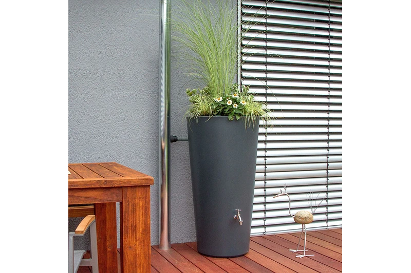Deze stijlvolle antraciet kleurige regentonnen met geintregeerde plantenbak combineren het nuttige met het aangename. De ruimte van uw tuin wordt optimaal benut door de hoogte van de regenton (110cm) en door de mogelijkheid om de ton af te werken met planten. De regenton heeft een inhoud van 150 liter en is voorzien van een filtersysteem in de plantenbak om overtollig water direct af te voeren.