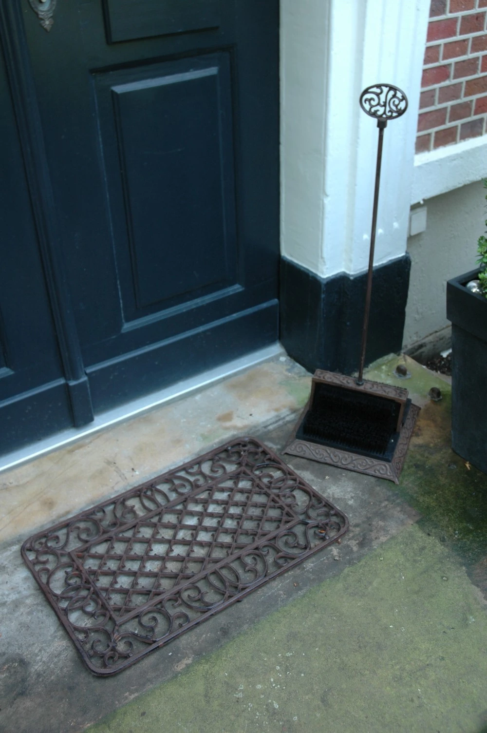 Deze rechthoekige gietijzeren deurmat zorgt voor een klassieke entree. De mat heeft een Victoriaans patroon met sierlijke krullen en is per stuk met de hand gegoten volgens eeuwenoud vakmanschap en traditie.