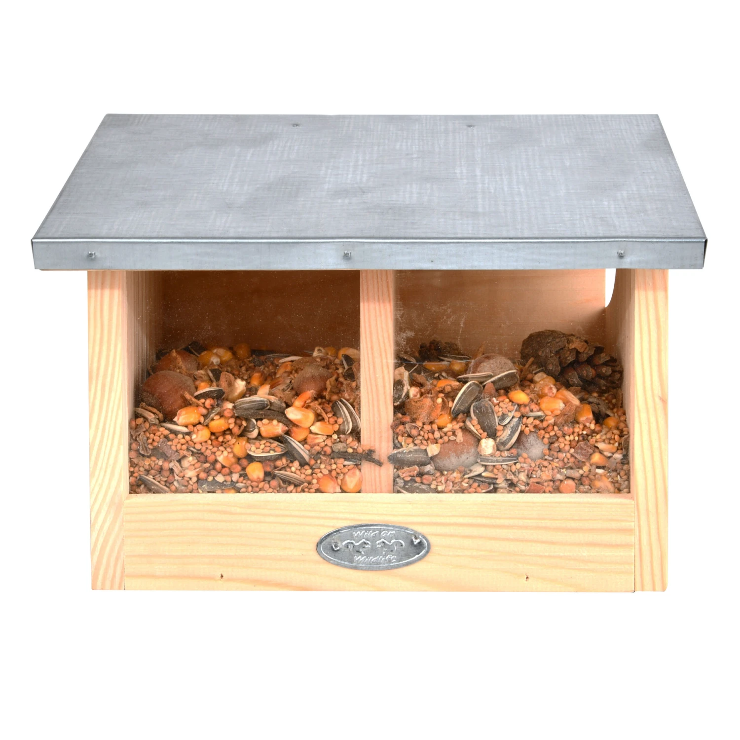 Eekhoorns zijn echte acrobaten in bomen en struiken. Ze gaan slim te werk bij het bemachtigen van voedsel. Deze knaagdieren eten bij voorkeur pinda’s, walnoten, hazelnoten en zonnebloempitten. Ten spijt van vele vogelliefhebbers beschadigen en plunderen eekhoorns vaak de vogelvoederhuizen. Dit speciaal voor de eekhoorns ontworpen voederhuis kan zowel met noten als met eekhoornvoer gevuld worden. Bovendien laten deze vlotte dieren zich eenvoudiger observeren wanneer ze aan het eten zijn.