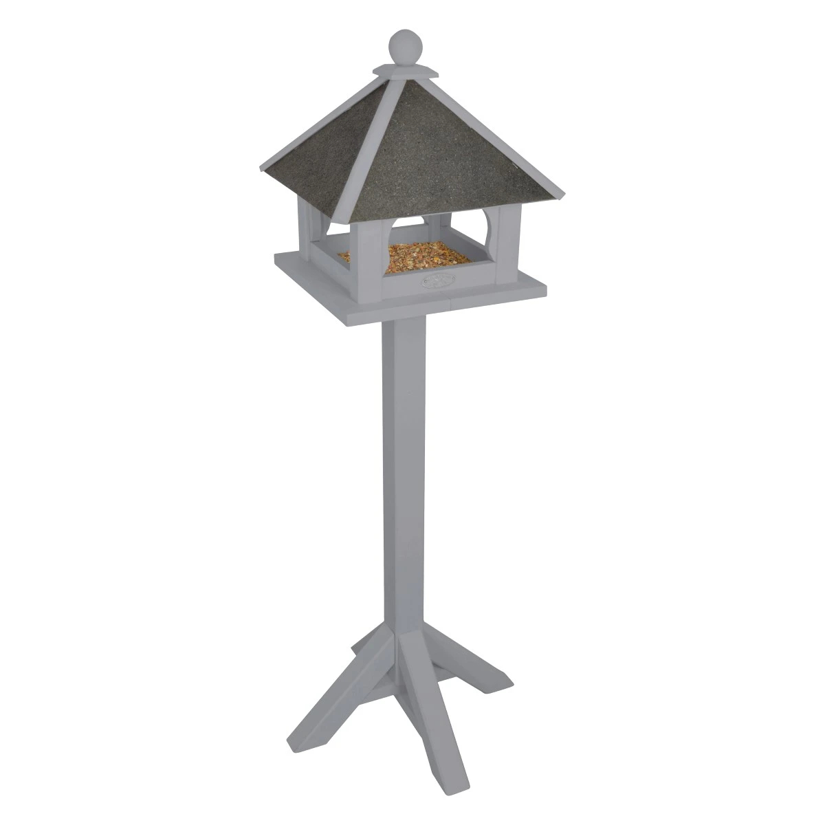 Robuuste simpele houten meubels en accessoires vormden jarenlang de entourage in de keuken en het leefgedeelte op boerderijen. Het kwalitatief hoogstaande hout zorgt voor een mooie afwerking en stabiliteit. Deze voedertafel met landelijke uitstraling biedt vogels een fijne voederplaats. Door de open structuur kunnen de vogels van alle kanten aanvliegen, en zo plaatsnemen op het voederplateau. Het bitumen dak zorgt ervoor dat het voer droog blijft. Met de vierpotige voet heeft de voedertafel op elke ondergrond een goede stabiliteit.