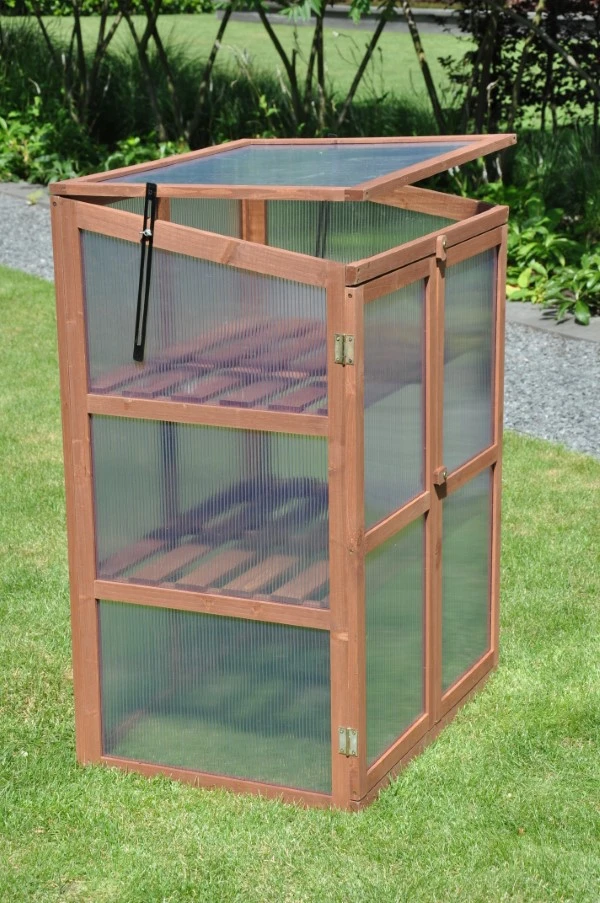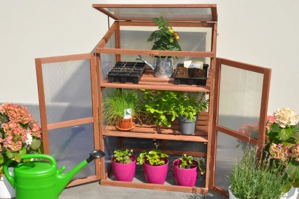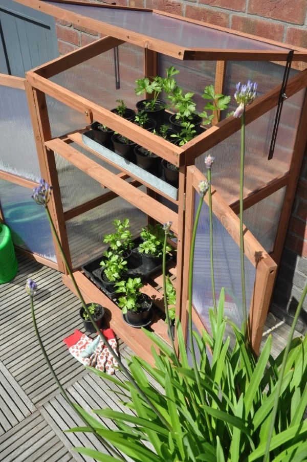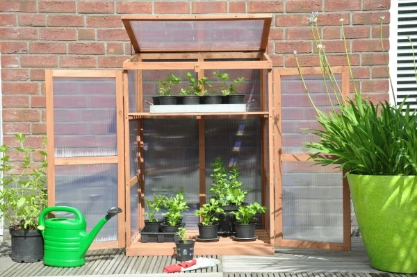 Ideaal voor de kweker die graag dicht bij huis van start gaat. Al vanaf het vroege voorjaar kan deze patiokas in gebruik worden genomen. Geschikt voor gebruik op het balkon, het terras of gewoon in de tuin. De Rosemary’s Choice beschermt gewassen tegen wind, hagel, nachtvorst en ongedierte. Deze patiokas bestaat uit een houten frame en heeft een kunststof afdichting. Het hout is bruin verduurzaamd en afkomstig uit goed beheerde bossen. De afdichting van polycarbonaat heeft een dikte van 4 mm en is dubbelwandig. Polycarbonaat heeft verschillende voordelen: het is het niet gevoelig voor breuk, geheel veilig in gebruik en heeft het bovendien een isolerende werking. De Rosemary’s Choice wordt geleverd in prefabricage, dit betekend dat de zijwanden, schappen, achterzijde, draaideuren en ‘klep’ aan de bovenzijde, al per onderdeel gemonteerd zijn bij levering. Het aan elkaar bevestigen van de onderdelen is een eenvoudige montageklus. De 2 meegeleverde schoorijzers zorgen voor een sterk verband en de mogelijkheid om de broeikas met behulp van schroeven vast te zetten op een houten of stenen ondergrond. Om optimaal gebruik te kunnen maken van deze patiokas worden de schappen (2 stuks) standaard meegeleverd en kunt u kweken op 3 verschillende niveaus. De ‘klep’ aan de bovenzijde kan in verschillende standen worden geopend en daarna windvast geborgd.