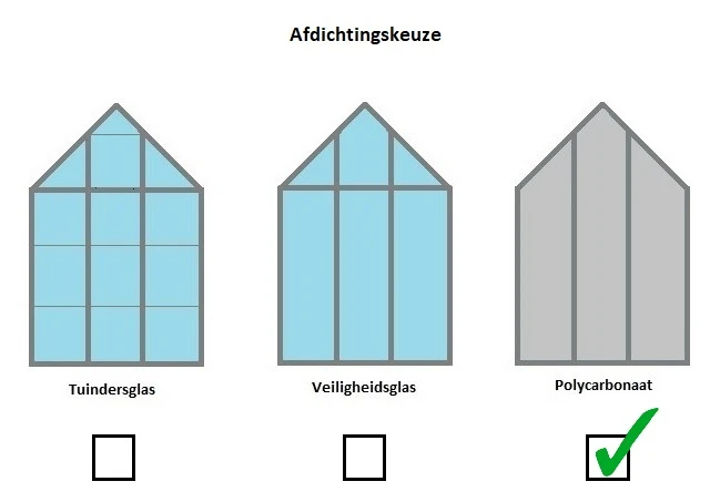 Tuindersglas is de goedkoopste optie maar kan door een dikte van 3mm sneller breken. Het laat 90% van het licht door, waardoor de planten en kruiden in jouw kweekkas goed kunnen groeien. Veiligheidsglas is tot zes keer sterker en zal veel minder snel breken. Wanneer het wel breekt, valt het uiteen in botte delen waardoor dit glas een stuk veiliger is. Ook veiligheidsglas laat ongeveer 90% van het licht door in de tuinkas. Polycarbonaat is als enige niet transparant en laat minder licht door. Planten die snel verbranden voelen zich daardoor erg thuis in een tuinkas van polycarbonaat. Het breekt veel minder snel dan glas en heeft een goed isolerende functie.